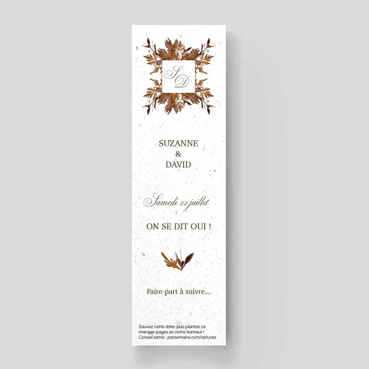 Un Save-the-Date mariage à semer au format marque-pages, aux couleurs de l’automne.